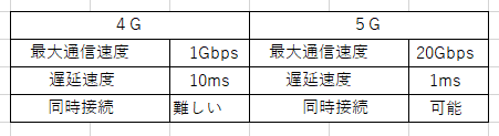 4Gと5Gを比較すると、5Gの通信速度が、20倍も上がっていることが分かります。