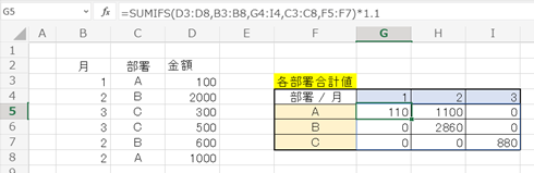 G5セルに「=SUMIFS(D3:D8,B3:B8,G4:I4,C3:C8,F5:F7)」を入力することで