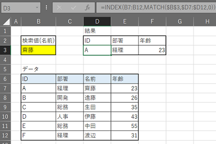図のようなデータテーブル上で検索値に入力した名前からID、部署、年齢などの必要情報を結果(D3~F3セル)取り出してみます。