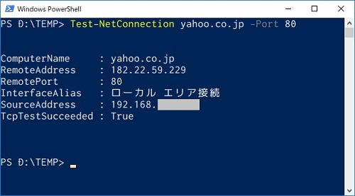 ちなみにTest-NetConnectionは-Portオプションを使うことでTCPポートを指定しての疎通確認が出来ます。