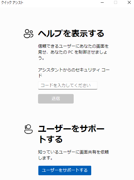 クイックアシストとは、別のPCにセキュリティコードを入力してもらうことで、接続先のPC画面を表示させるツールです。制御を譲渡することで、接続しているユーザーがマウス操作を代理で行うこともできます。